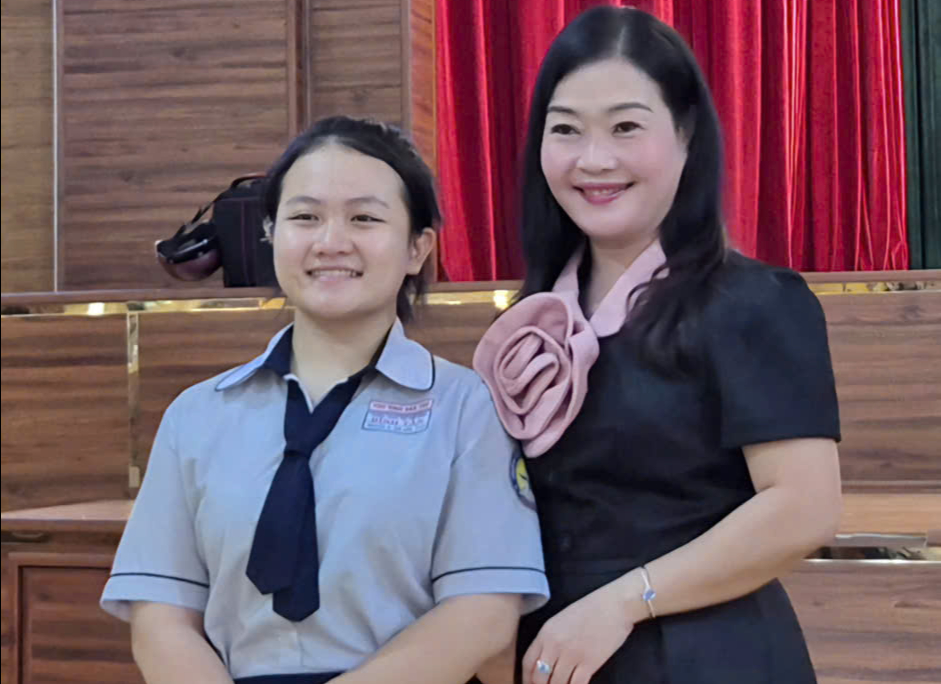 Trường THPT Bình Tân, một trường vùng ven ở khu vực 1, năm nay có 1 học sinh đậu đội tuyển môn văn. Trong ảnh: cô Nguyễn Thị Kim Huệ, Hiệu trưởng Trường THPT Bình Tân, chúc mừng học sinh của mình - Ảnh: H.H.