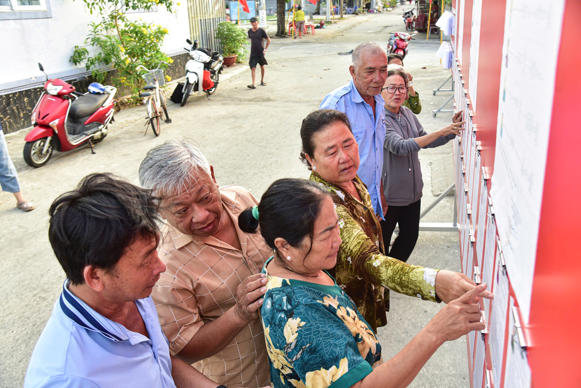 Người dân xem danh sách cử tri niêm yết tại khu vực bỏ phiếu số 2 (ấp Phong Thạnh và ấp Miễu Nhì, xã Cần Giờ, TP.HCM)