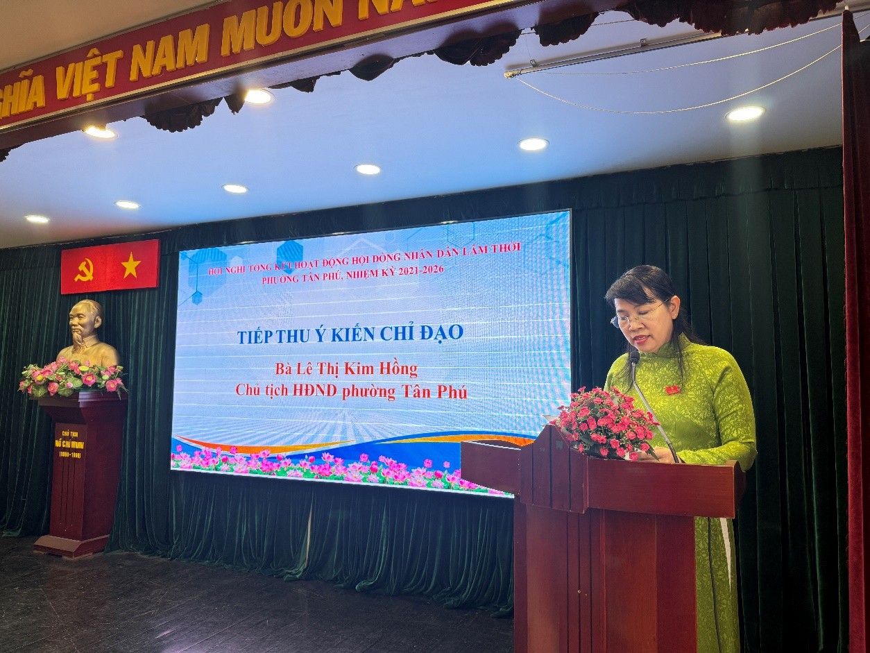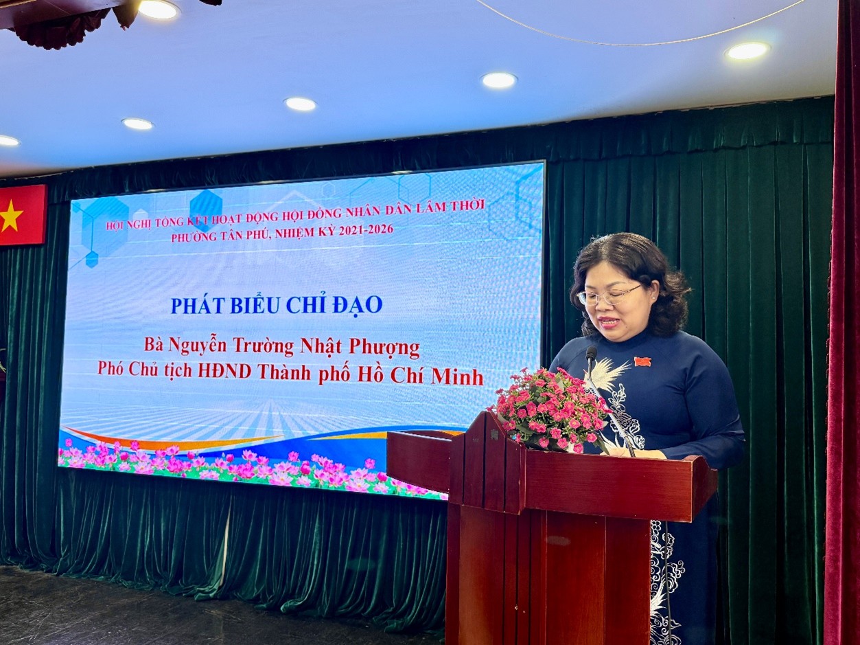 Phát biểu chỉ đạo tại Hội nghị, bà Nguyễn Trường Nhật Phượng ghi nhận và đánh giá cao những nỗ lực, đóng góp của Hội đồng nhân dân lâm thời phường Tân Phú trong nhiệm kỳ qua. Đồng thời định hướng một số nhiệm vụ trọng tâm nhằm tiếp tục đổi mới, nâng cao hiệu lực, hiệu quả hoạt động của HĐND phường: công tác Bầu cử đại biểu Quốc hội khóa XVI và bầu cử đại biểu HĐND các cấp nhiệm kỳ 2026-2031 sắp đến;