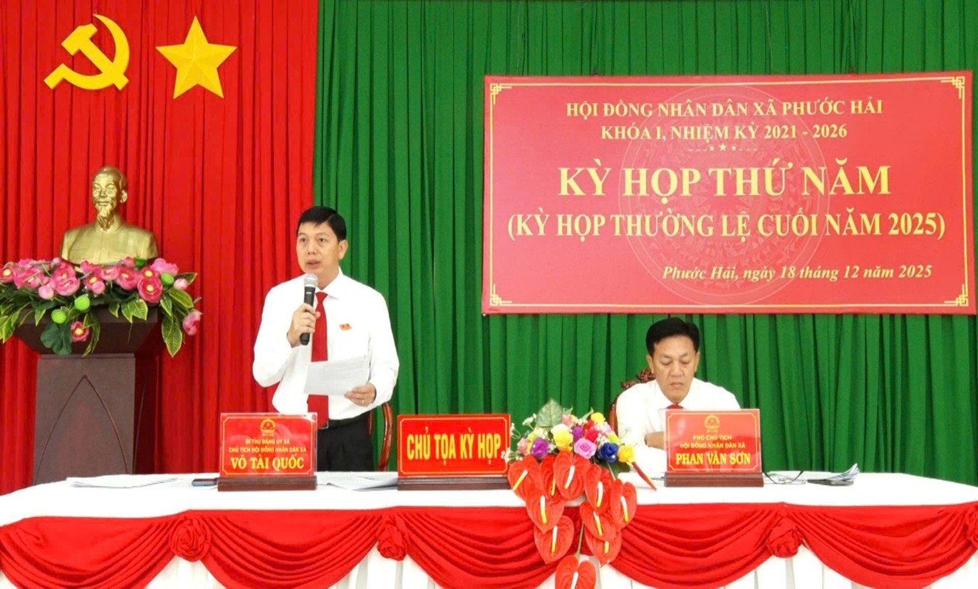 Sáng ngày 18/12, HĐND xã Phước Hải khoá I, nhiệm kỳ 2021-2026 tổ chức kỳ họp thứ Năm - kỳ họp thường lệ cuối năm 2025 nhằm đánh giá việc thực hiện Nghị quyết phát triển kinh tế - xã hội năm 2025; thống nhất mục tiêu, nhiệm vụ, giải pháp chủ yếu năm 2026 và quyết định nhiều nội dung quan trọng khác theo thẩm quyền. Ông Võ Tài Quốc, Bí thư Đảng uỷ-Chủ tịch HĐND xã và ông Phan Văn Sơn, Phó Chủ tịch HĐND xã đồng chủ trì kỳ họp.