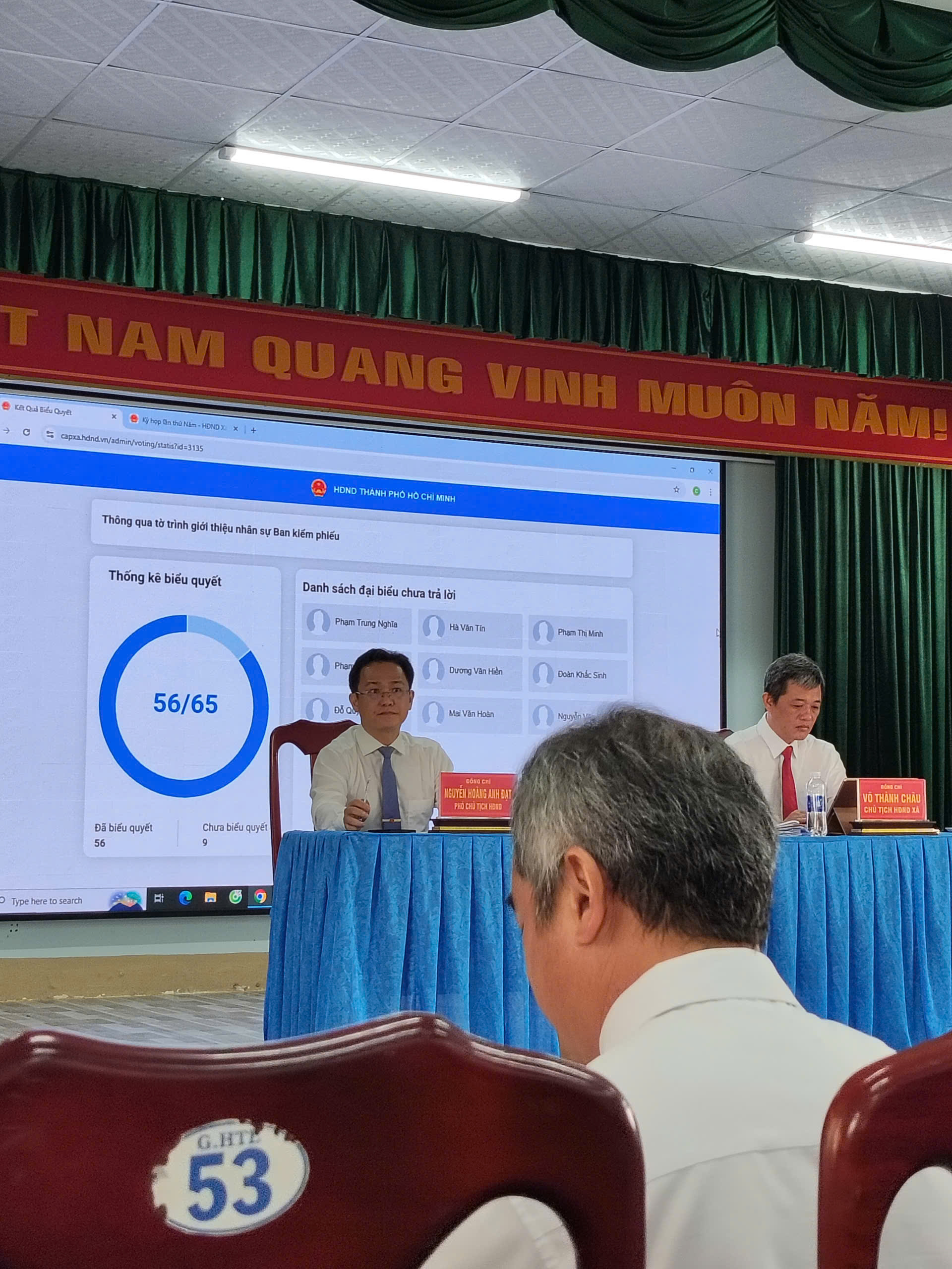 Thực hiện theo Kế hoạch số 675/KH-HĐND ngày 27/10/2025 của Thường trực Hội đồng nhân dân Thành phố Hồ Chí Minh về việc triển khai thử nghiệm phần mềm điều hành kỳ họp Hội đồng nhân dân các xã, phường, đặc khu trên địa bàn Thành phố Hồ Chí Minh, cũng tại Kỳ họp HĐND xã lần này, đã thực hiện việc ứng dụng công nghệ thông tin, sử dụng phần mềm ứng dụng HĐND trong công tác tổ chức và điều hành kỳ họp. Tài liệu phục vụ kỳ họp được số hóa, gửi đến đại biểu kịp thời; việc theo dõi nội dung, thảo luận và biểu quyết được thực hiện trên nền tảng điện tử góp phần tiết kiệm thời gian, không sử dụng tài liệu giấy, nâng cao tính công khai, minh bạch và hiệu quả hoạt động của HĐND xã. Việc từng bước triển khai mô hình kỳ họp không giấy, HĐND số thể hiện nỗ lực đổi mới phương thức làm việc, phù hợp với yêu cầu chuyển đổi số và cải cách hành chính.