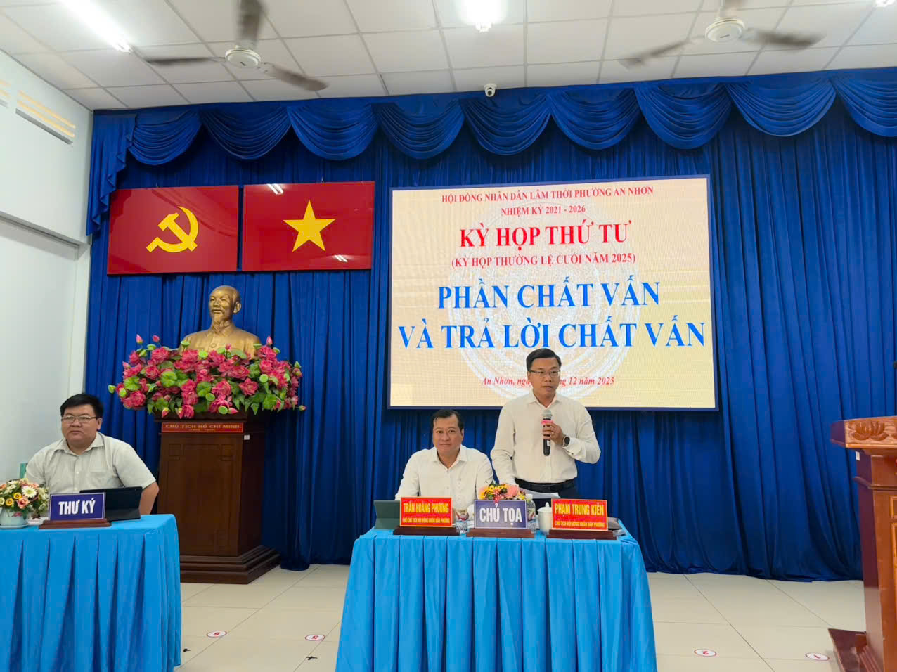 Ngày 19/12/2025, Hội đồng nhân dân lâm thời phường An Nhơn tổ chức Kỳ họp thứ Tư (Kỳ họp thường lệ cuối năm 2025) nhằm đánh giá tình hình thực hiện nhiệm vụ năm 2025 và quyết định phương hướng, mục tiêu, nhiệm vụ năm 2026; đồng thời xem xét, quyết nghị các nội dung quan trọng, cấp thiết phục vụ phát triển kinh tế - xã hội, bảo đảm quốc phòng - an ninh trên địa bàn.