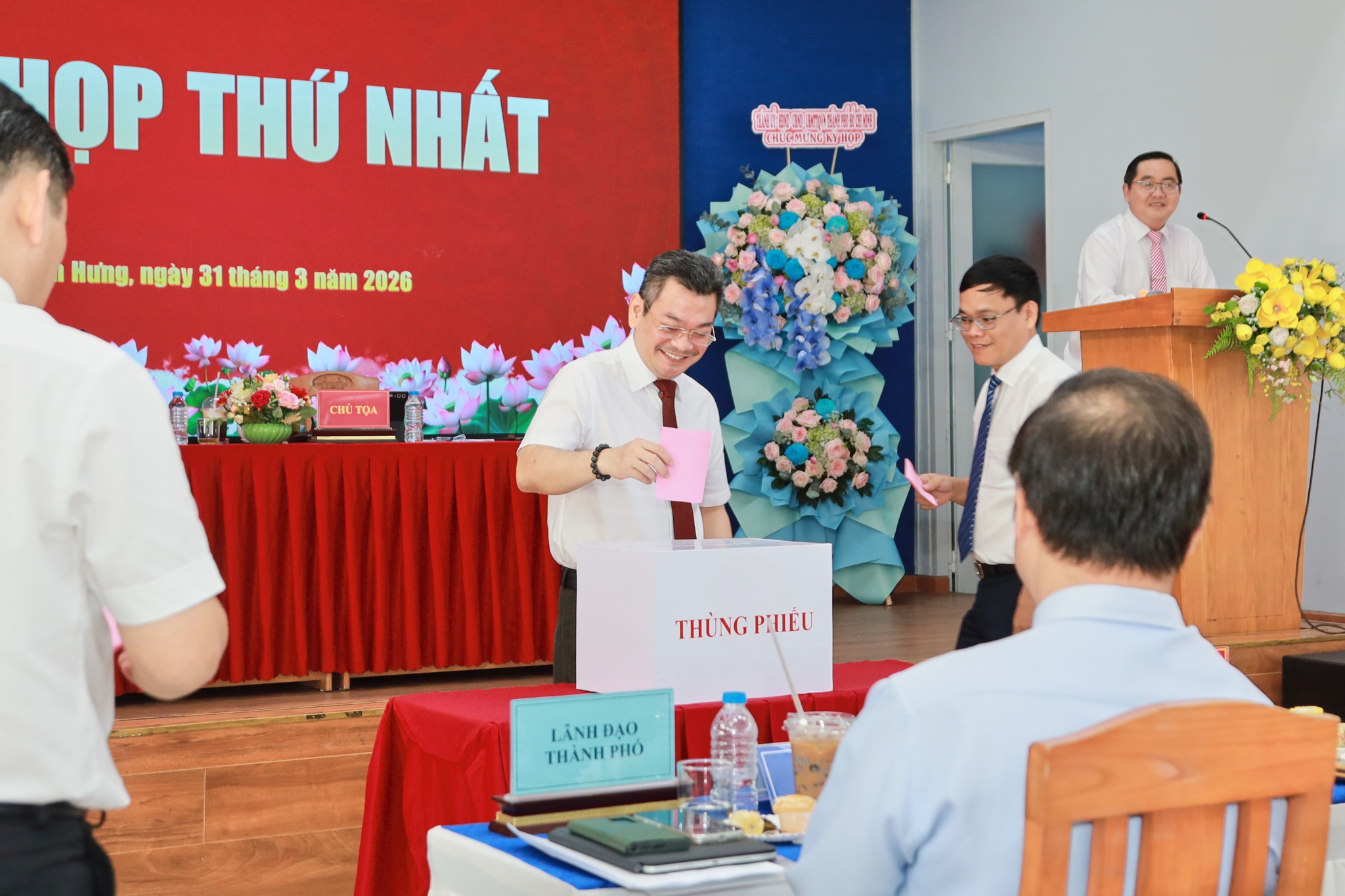 Với tinh thần dân chủ, trách nhiệm cao, kỳ họp đã tiến hành bầu các chức danh chủ chốt của HĐND và UBND phường nhiệm kỳ 2026 – 2031. Toàn bộ quy trình bầu cử được thực hiện nghiêm túc, đúng quy định, công khai, minh bạch. Kết quả: - Đồng chí Hoàng Minh Tuấn Anh được bầu giữ chức Chủ tịch HĐND phường. - Đồng chí Lâm Hữu Phương được bầu giữ chức Phó Chủ tịch HĐND phường. - Đồng chí Nguyễn Đức Trí được bầu giữ chức Chủ tịch UBND phường. Cùng các đồng chí Phó Chủ tịch UBND và Ủy viên UBND phường nhiệm kỳ 2026 – 2031. Bên cạnh đó, kỳ họp đã tiến hành bầu Trưởng, Phó Trưởng và các thành viên của các Ban HĐND phường; thông qua nghị quyết phê chuẩn số lượng, danh sách các Ban; tổ chức ra mắt bộ máy Thường trực HĐND, các Ban HĐND và UBND phường nhiệm kỳ mới.