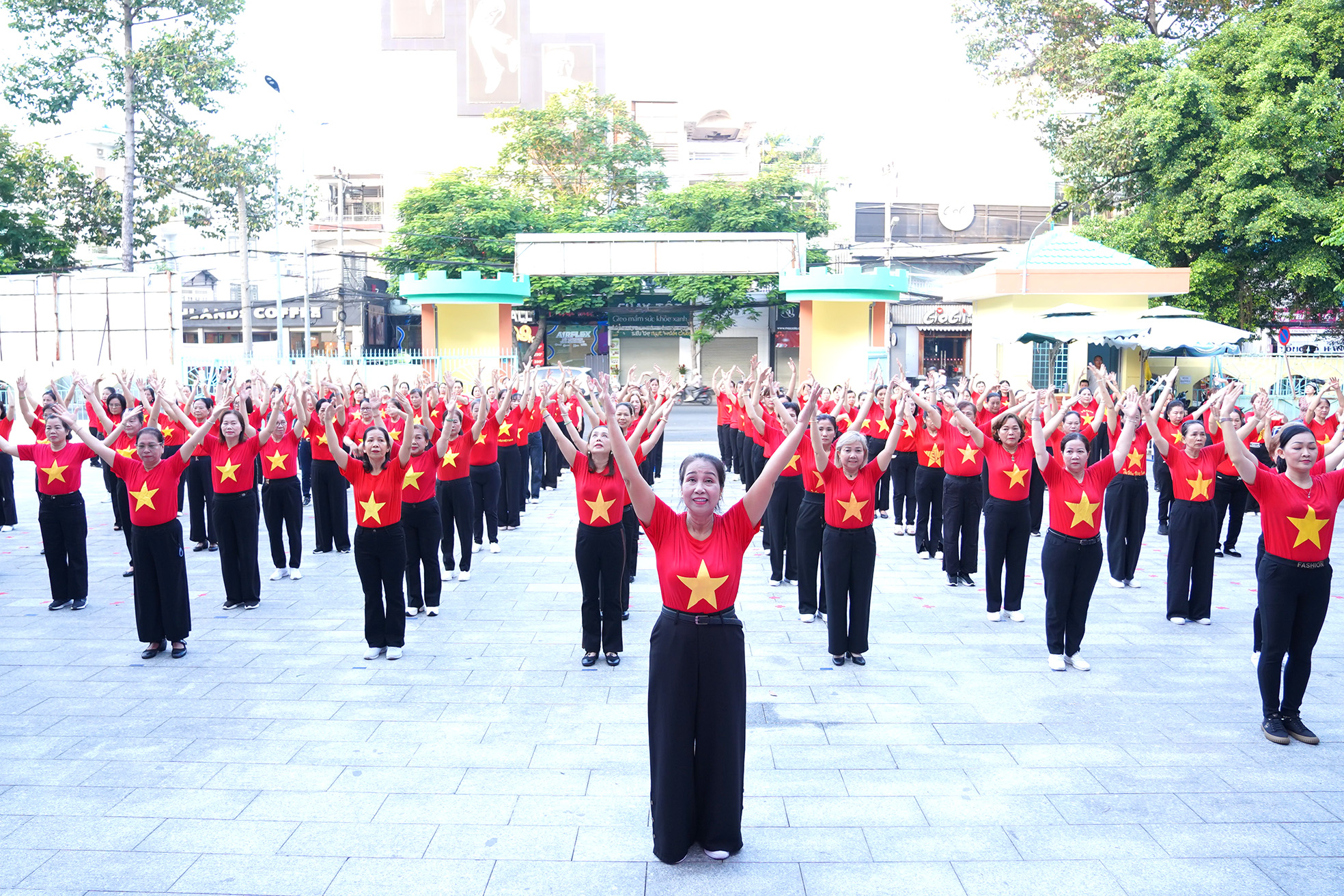 Cán bộ, hội viên phụ nữ phường Bảy Hiền phấn khởi tham gia màn đồng diễn