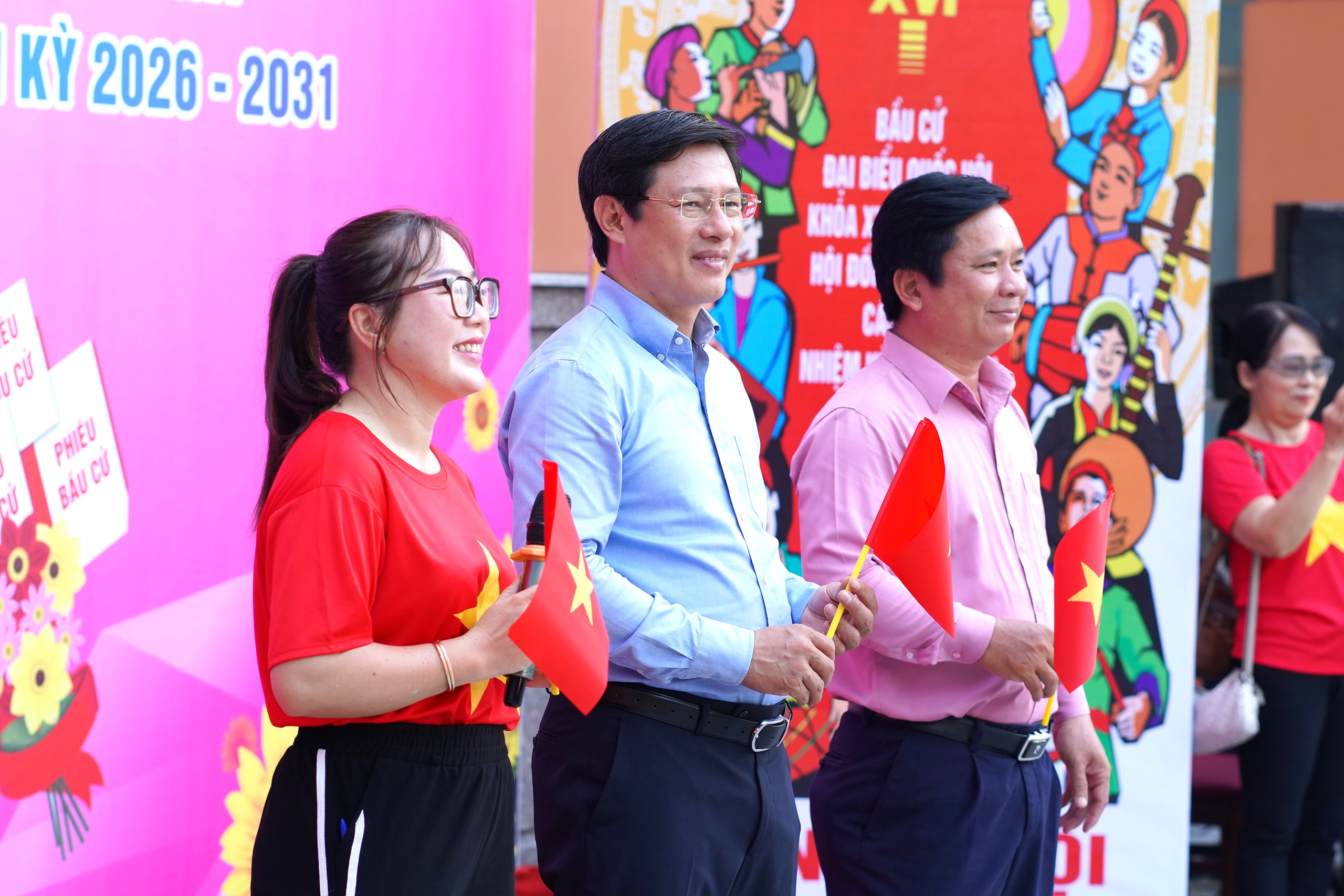 Đoàn diễu hành mang theo cờ cầm tay, băng rôn, khẩu hiệu tuyên truyền cuộc bầu cử đại biểu Quốc hội khóa XVI và đại biểu HĐND các cấp nhiệm kỳ 2026 – 2031.