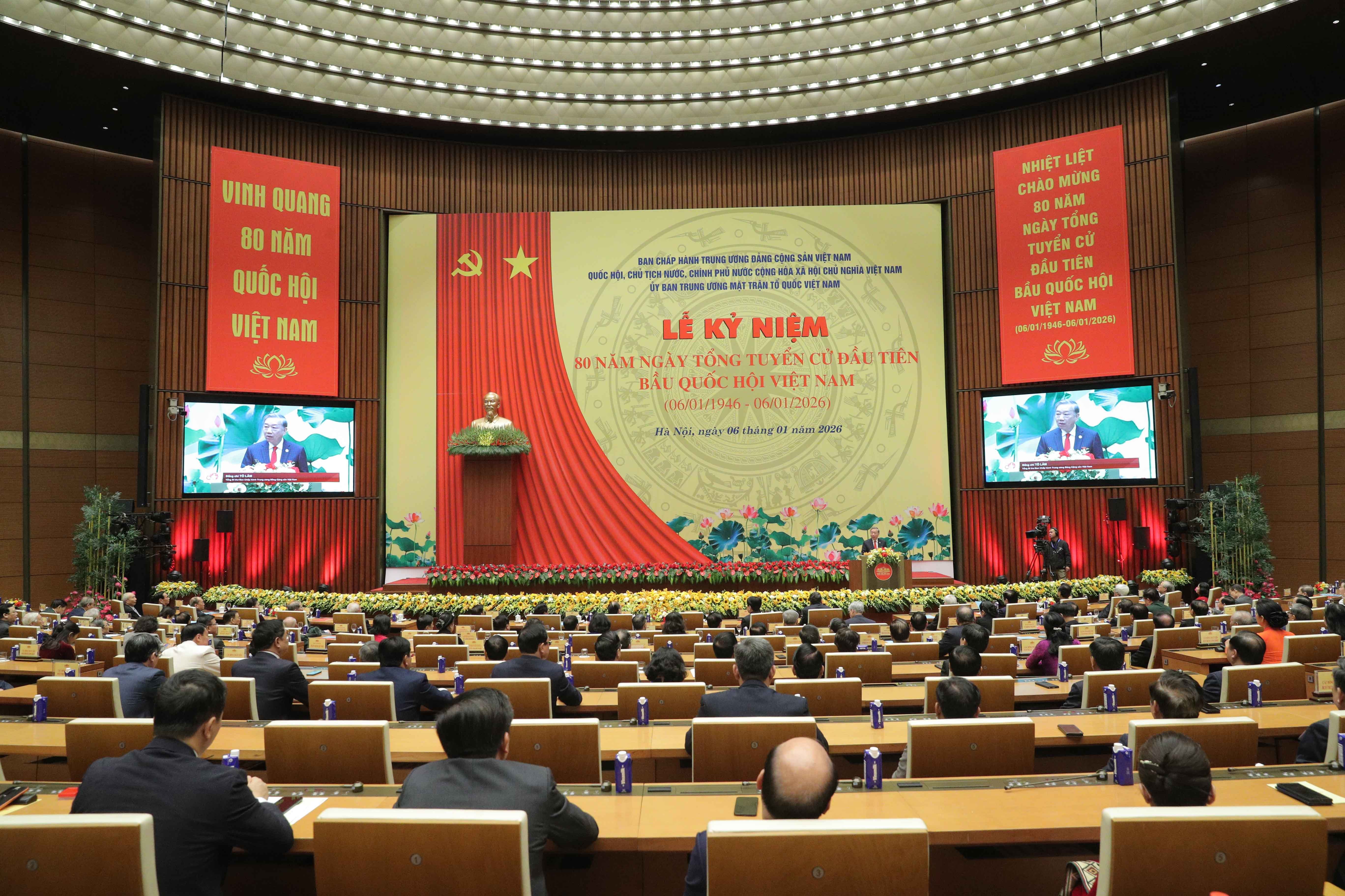 Hôm nay, trong không khí toàn Đảng, toàn dân, toàn quân ta đang ra sức thi đua lập thành tích chào mừng Đại hội đại biểu toàn quốc lần thứ XIV của Đảng, chúng ta long trọng tổ chức Lễ kỷ niệm 80 năm Ngày Tổng tuyển cử đầu tiên bầu ra Quốc hội của nước Việt Nam Dân chủ Cộng hòa, nay là nước Cộng hòa xã hội chủ nghĩa Việt Nam.