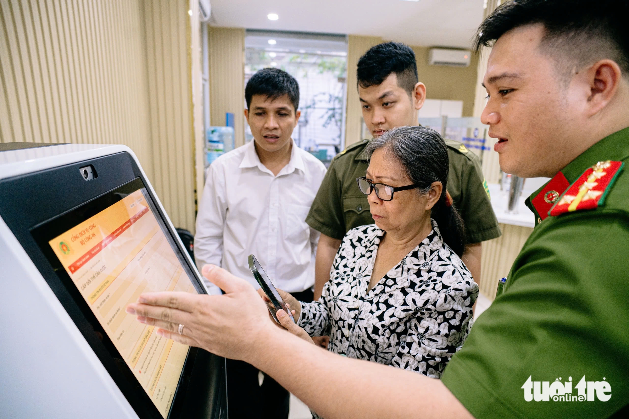 Bà Lê Thanh Xuân được hướng dẫn nhập thủ tục cấp đổi căn cước công dân trên hệ thống cổng dịch vụ công Bộ Công an đặt tại trụ sở Công an phường Sài Gòn