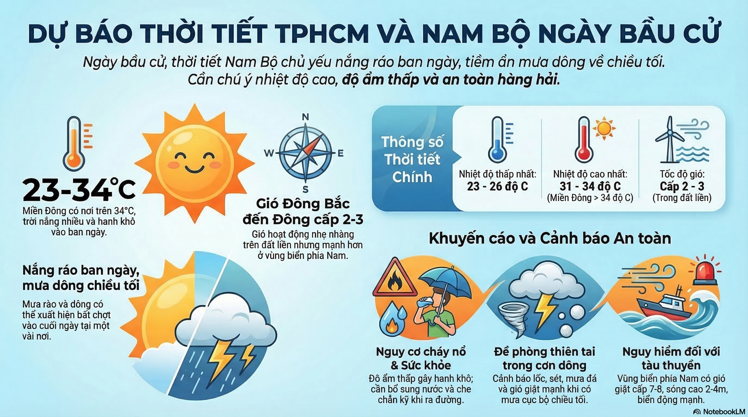 Hôm nay (15-3) - ngày bầu cử đại biểu Quốc hội khóa XVI và đại biểu HĐND các cấp nhiệm kỳ 2026-2031 - Trung tâm Dự báo Khí tượng Thủy văn Quốc gia dự báo thời tiết tại TPHCM và Nam Bộ có mây, ban ngày nắng; chiều tối và đêm có mưa rào và dông vài nơi. Gió Đông Bắc đến Đông hoạt động cấp 2-3.