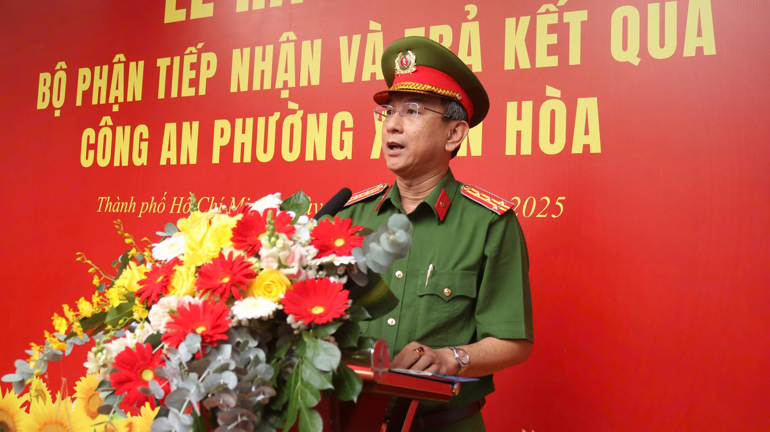 Đại tá Trần Hồng Minh, Phó giám đốc Công an TP.HCM) phát biểu tại lễ ra mắt Bộ phận tiếp nhận, trả kết quả giải quyết thủ tục hành chính cấp xã tại Công an phường Xuân Hòa